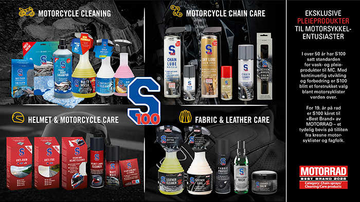 S100 Kjedespray og Kjernerens: Spesialutviklede produkter for effektiv rengjøring og smøring av motorsykkelkjeder - med høy slitestyrke og minimalt søl.